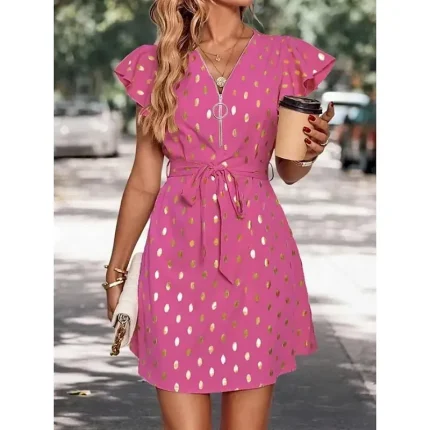 Women’s Casual Dress Polka Dot Zipper Print V Neck Mini Dress Stylish Casual Daily Date Short Sleeve Summer
