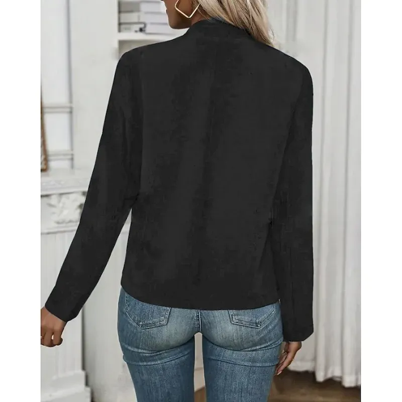 [Fabric]: Crafted from high-quality polyester, this women’s blazer offers a durable and comfortable wear. The fabric is lightweight yet warm, making it ideal for fall and winter seasons.