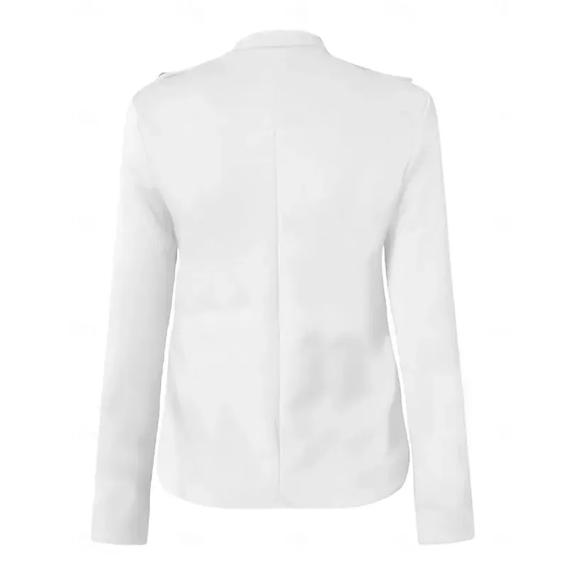 [Design Highlights]: Designed with long sleeves and a classic shirt collar, this blazer is adorned with large, metallic buttons on the front that add a touch of elegance and visual interest. Its minimalistic design enhances its versatility and sophistication.