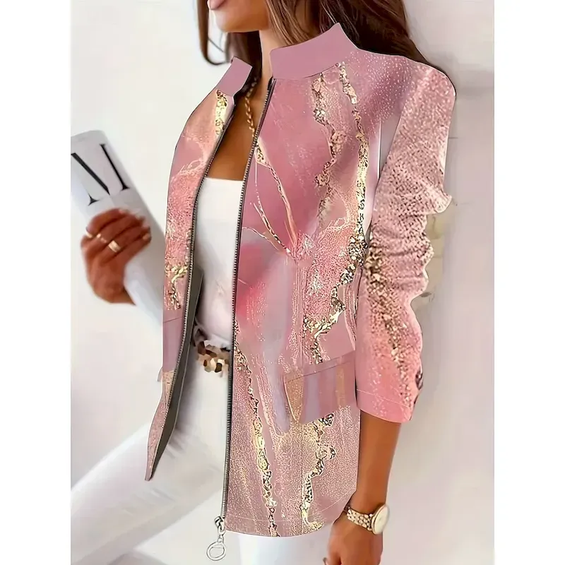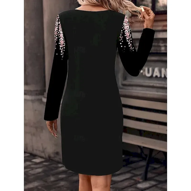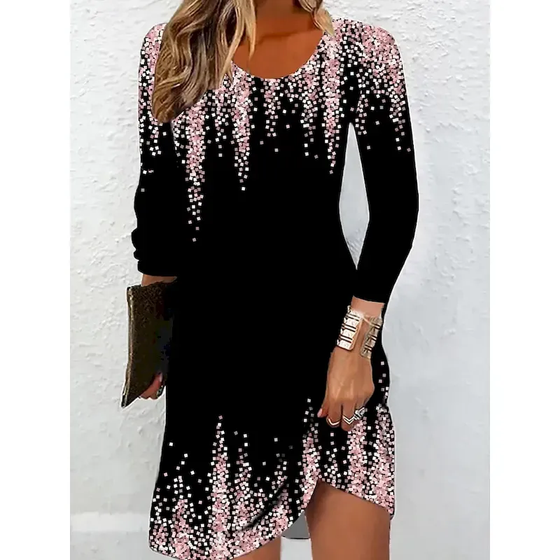 [Design Highlights]: The dress showcases a sophisticated floral print with a vibrant pink hue, beautifully contrasting against the dark base. The crew neckline adds a modern touch, while the long sleeves make it versatile for both day and night events.