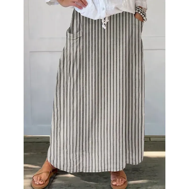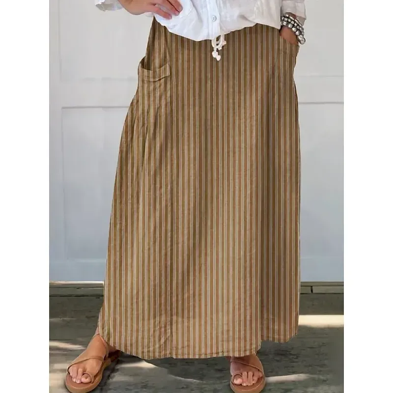 Women’s Skirt A Line Bohemia Vintage Casual Maxi High Waist Skirts Striped Pocket Print Micro-elastic Street Daily Blue Brown Apricot Gray Summer Polyester Cotton Blend