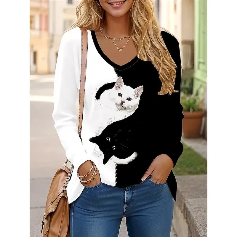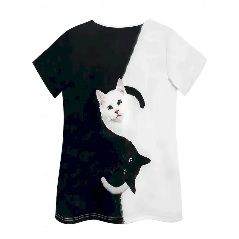 [Design Highlights]: The T-shirt stands out with its playful color block design and charming cat print, displaying a black and white split color scheme with illustrations of a black and white cat. This unique print adds a fun and stylish flair to your everyday outfit.