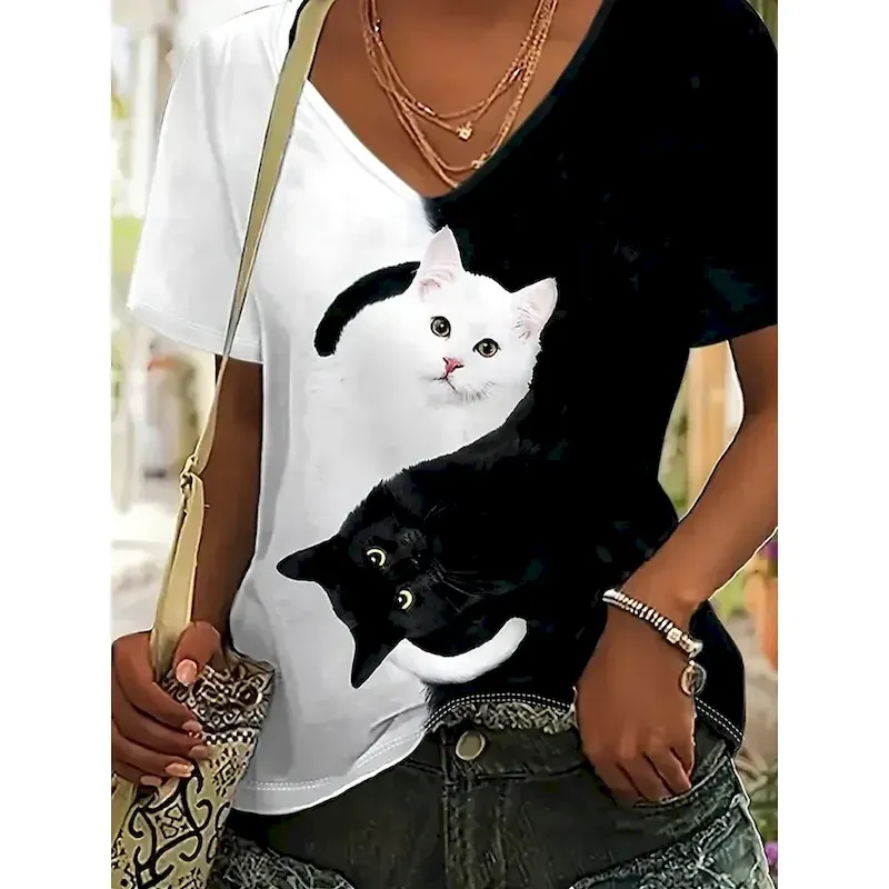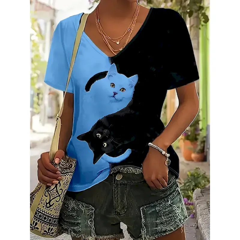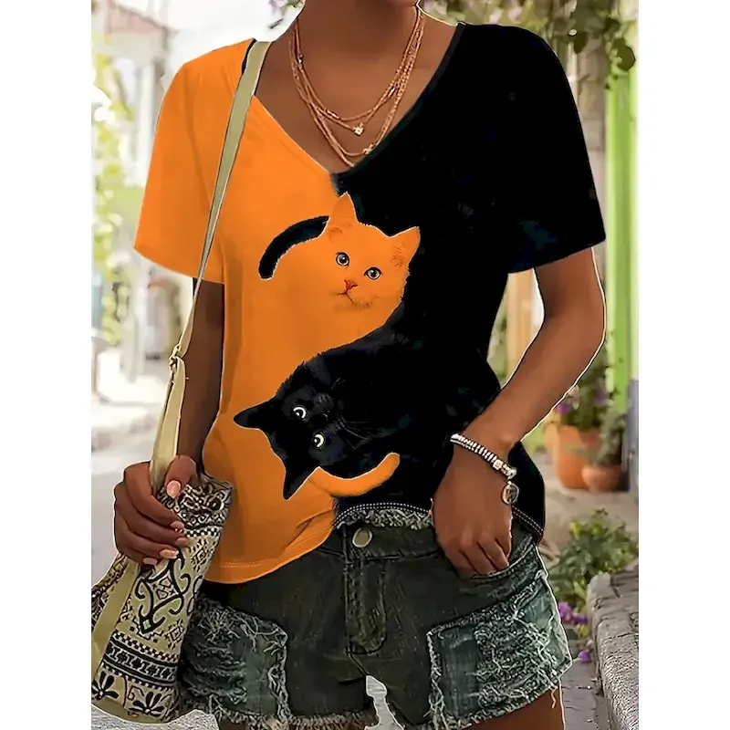 Women’s T Shirt Basic Casual Color Block Cat Print Short Sleeve Regular Tops V Neck Daily Black and White Blue Orange Summer