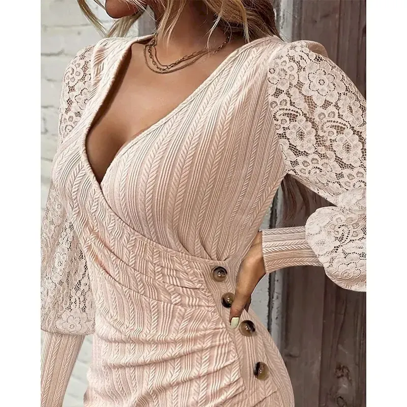 1.Dresses Type: Lace Dress Sheath Dress2.Fabric: Polyester3.Gender: Women’s4.Design: Buttons5.Occasion: Daily6.Dress Length Type: Midi Dress7.Neckline: V Neck8.Sleeve Length: Long Sleeve9.Season: Winter Fall